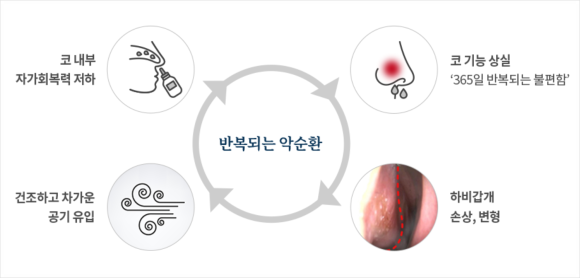 많은 분이 비염을 ‘염증’으로 오해하여 항히스타민제나 소염제, 혈관수축 스프레이를 남용합니다. 하지만 비염은 단순 염증 반응이 아닌 하비갑개의 기능 마비에서 오는 경우가 많습니다. 억지로 증상만 누르는 약물 치료는 오히려 하비갑개를 더욱 건조하게 만들어 비염질환 천식과 관계를 악화시킬 수 있습니다.